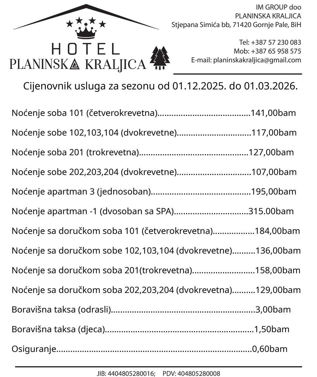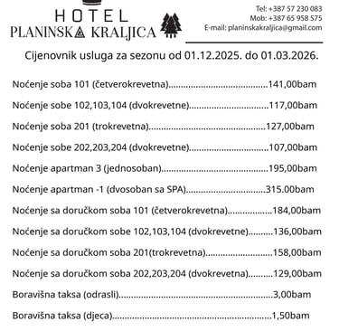 Cjenovnik za zimsku sezonu od 01.12.2025. do 01.03.2026.
