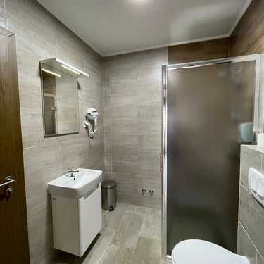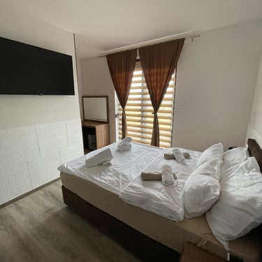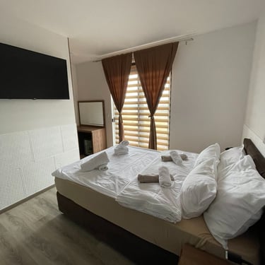 102,103,104,202,203,204 - Ove standardna dvokrevetne sobe opremljene su sa jednim bračnim krevetom 2,00m x 1,80m, MINIBAROM, u slučaju da vam je potrebno osvježenje posle radnih sati restorana, TV-om, za razonodu tokom boravka u sobi, SEFOM, za čuvanje dragocjenosti, ELEKTRIČNIM KUVALOM, u kojem možete ugrijati vodu za vaš omiljeni topli napitak, posjeduje WI-FI. U toaletu se nalaze sapun, šampon i fiksni fen za sušenje kose. (Razlika u cijeni je samo zbog veličine sobe)